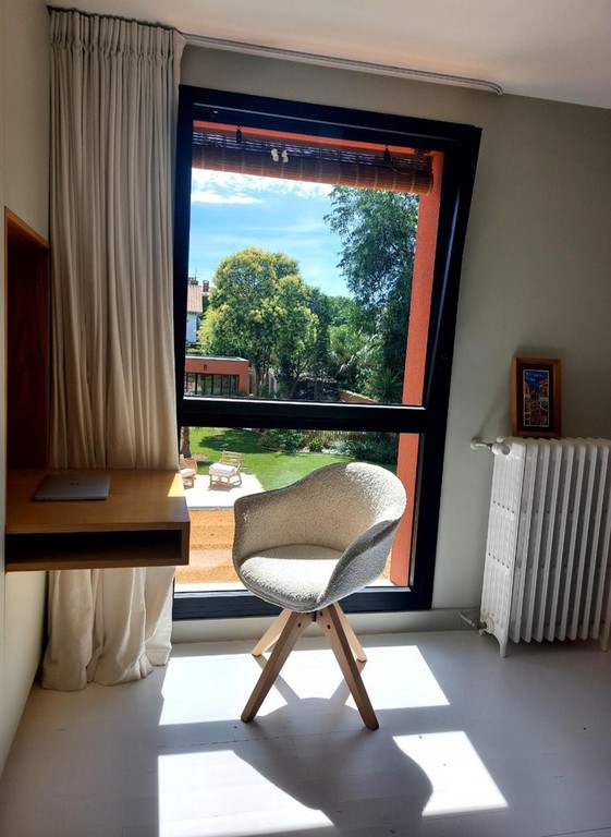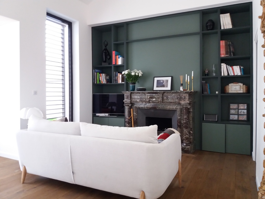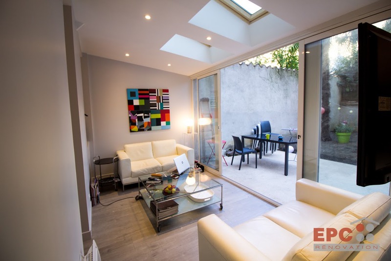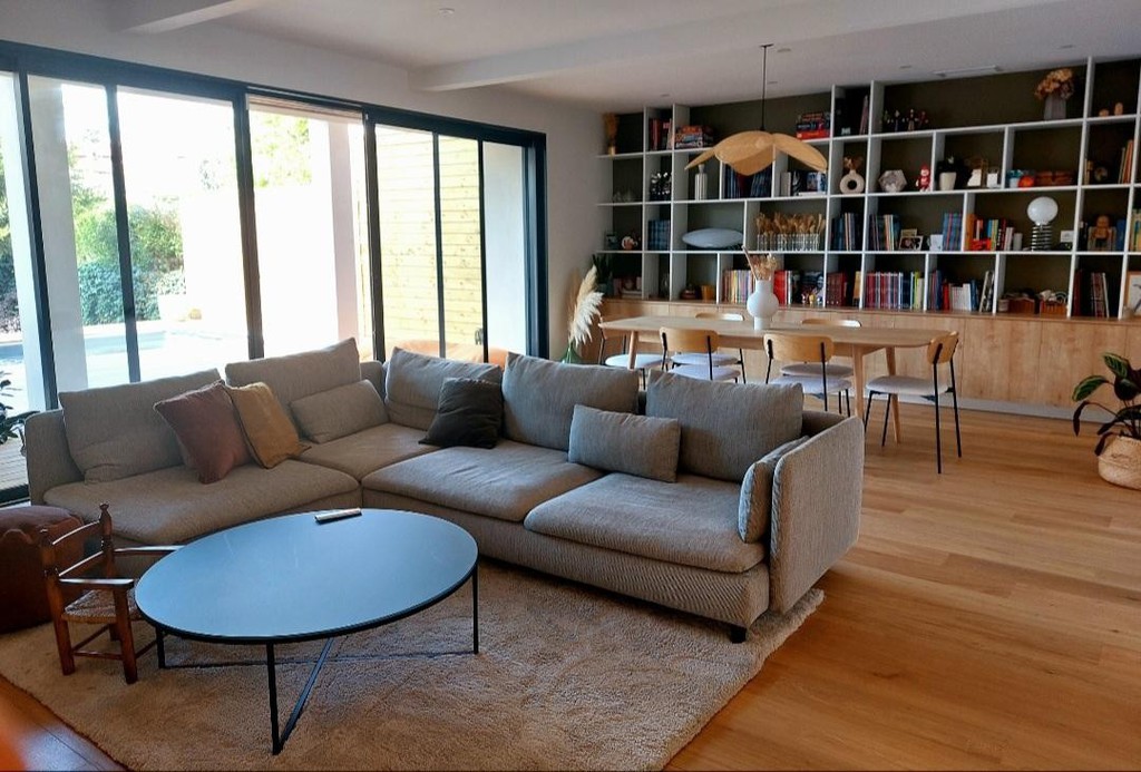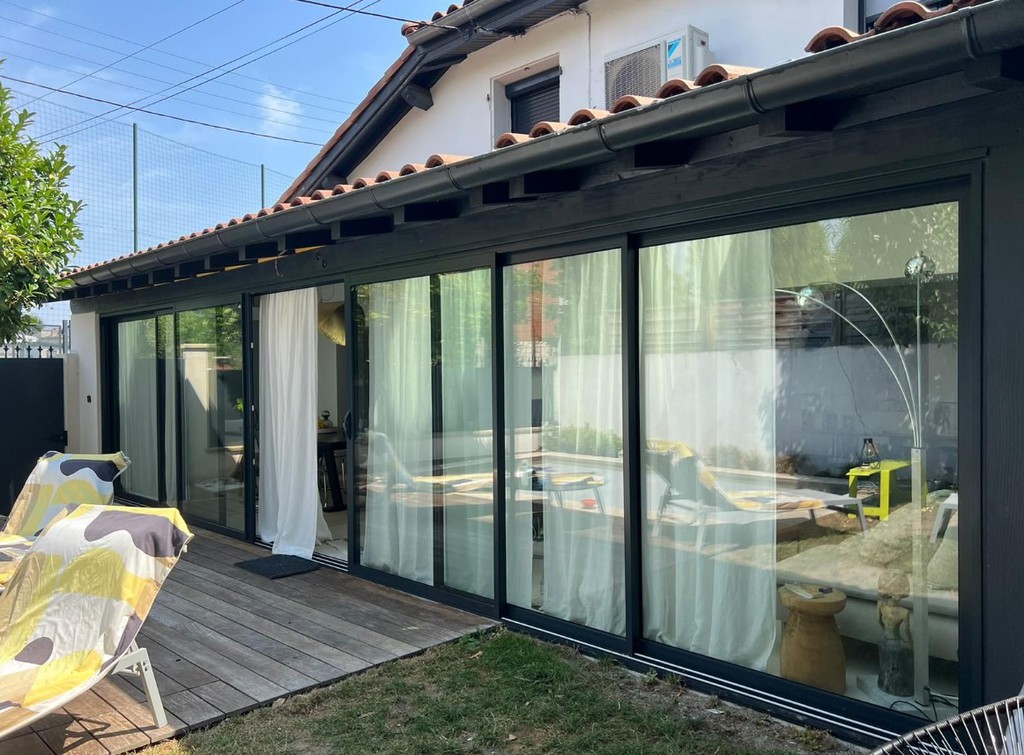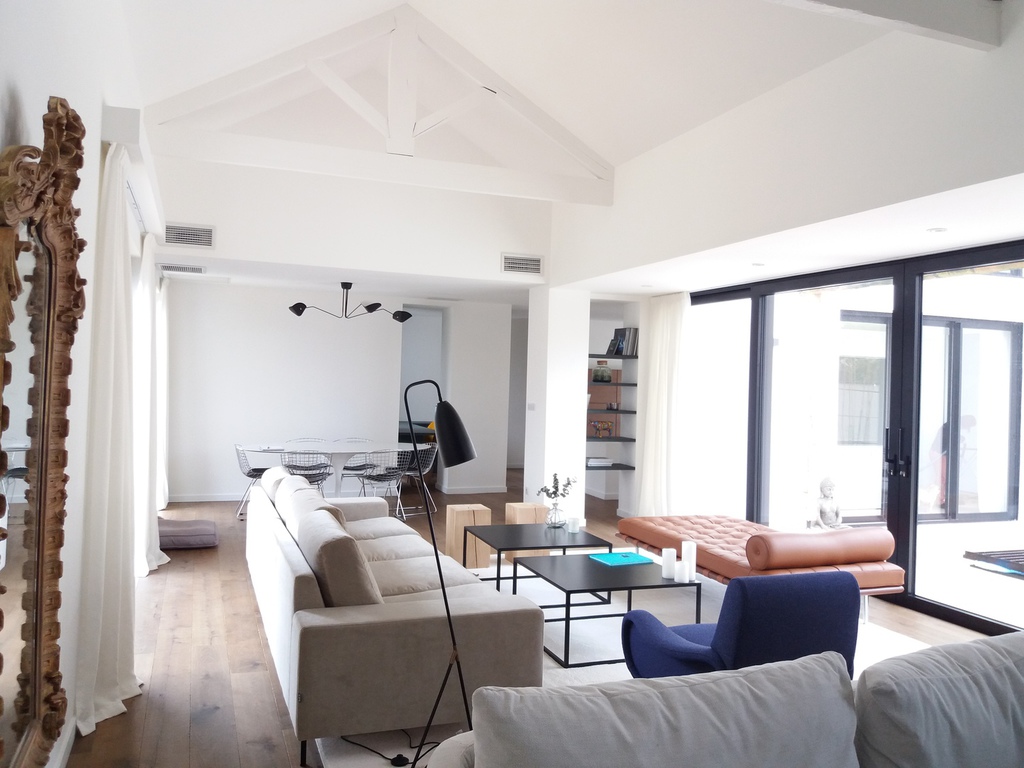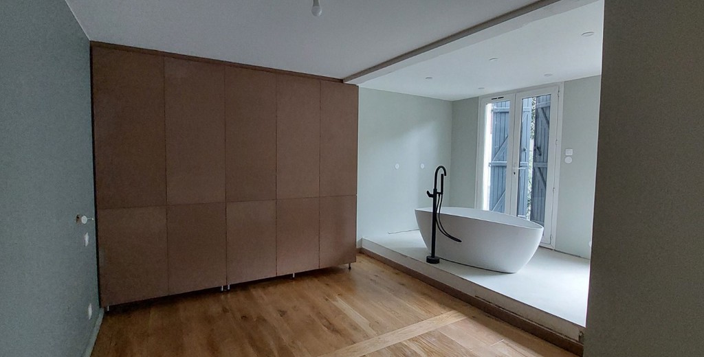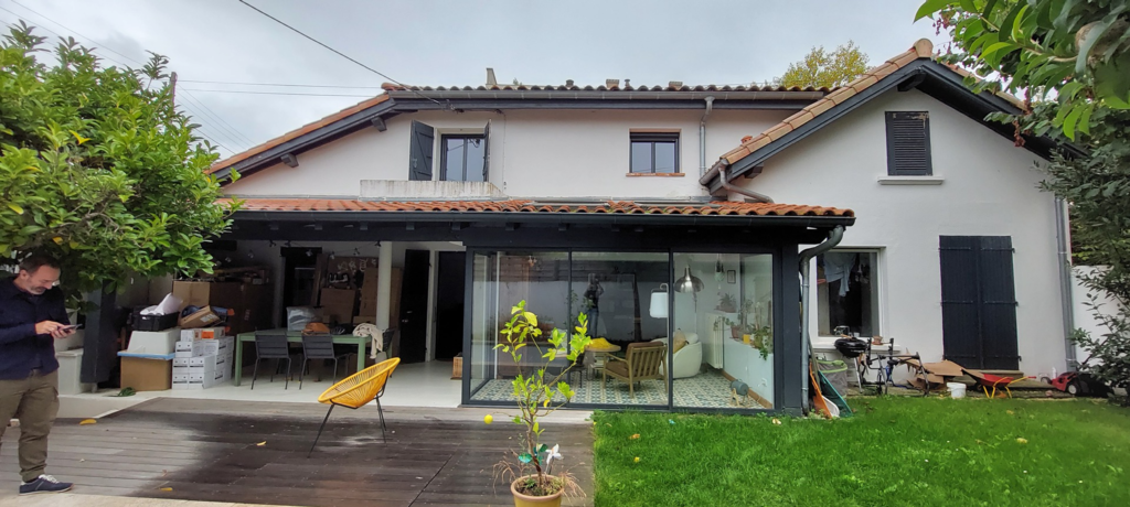 Petite extension sous une terrasse couverte. Une nouvelle baie vitrée de 9 mètres vient habiller la nouvelle façade. Rénovation de la maison (sols et peintures) et réaménagement complet de la chambre parentale - salle de bains -dressing.