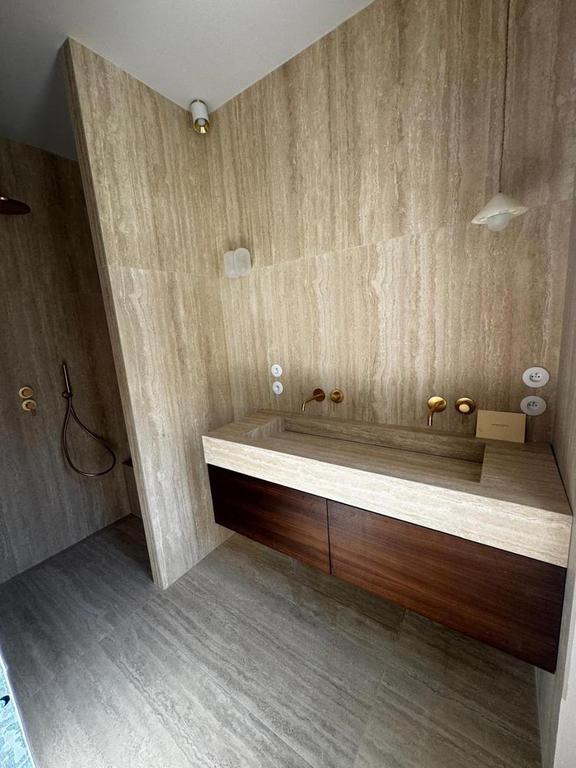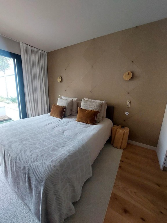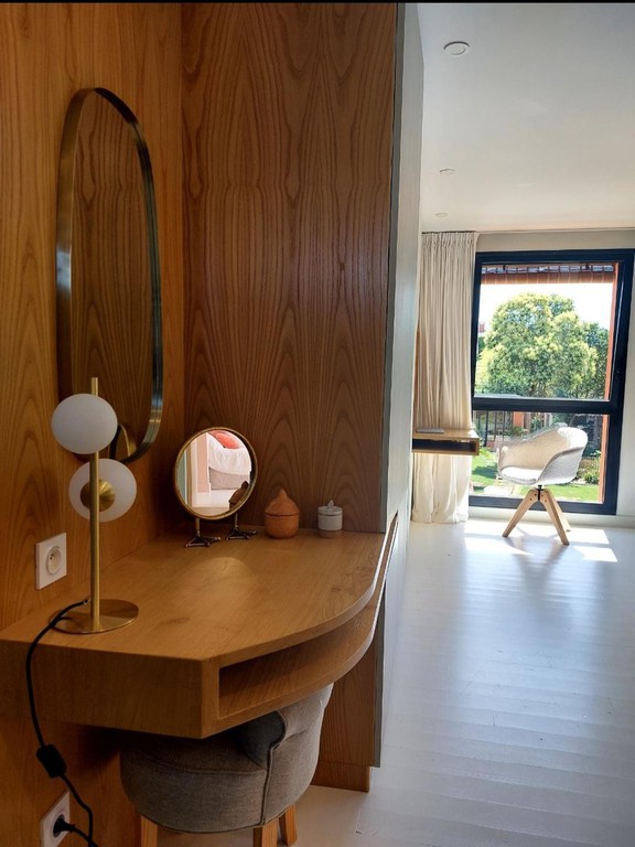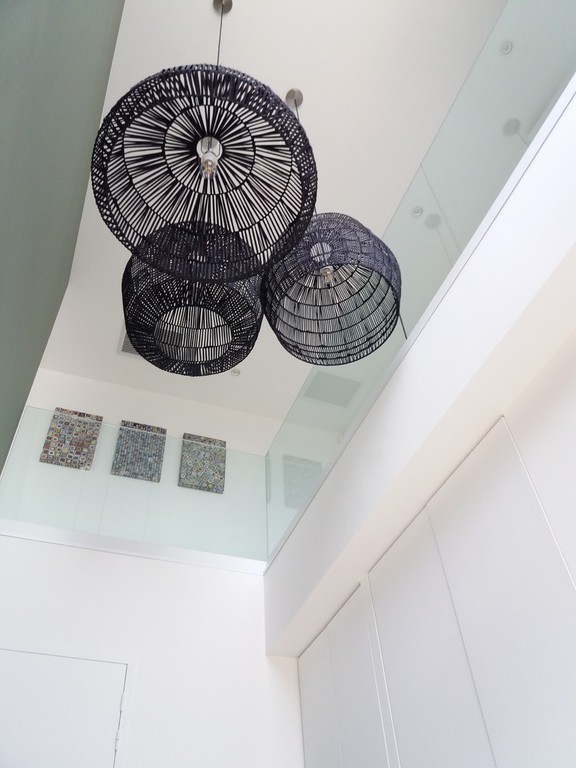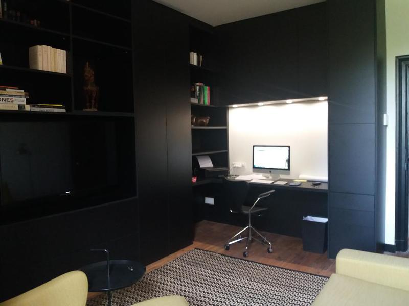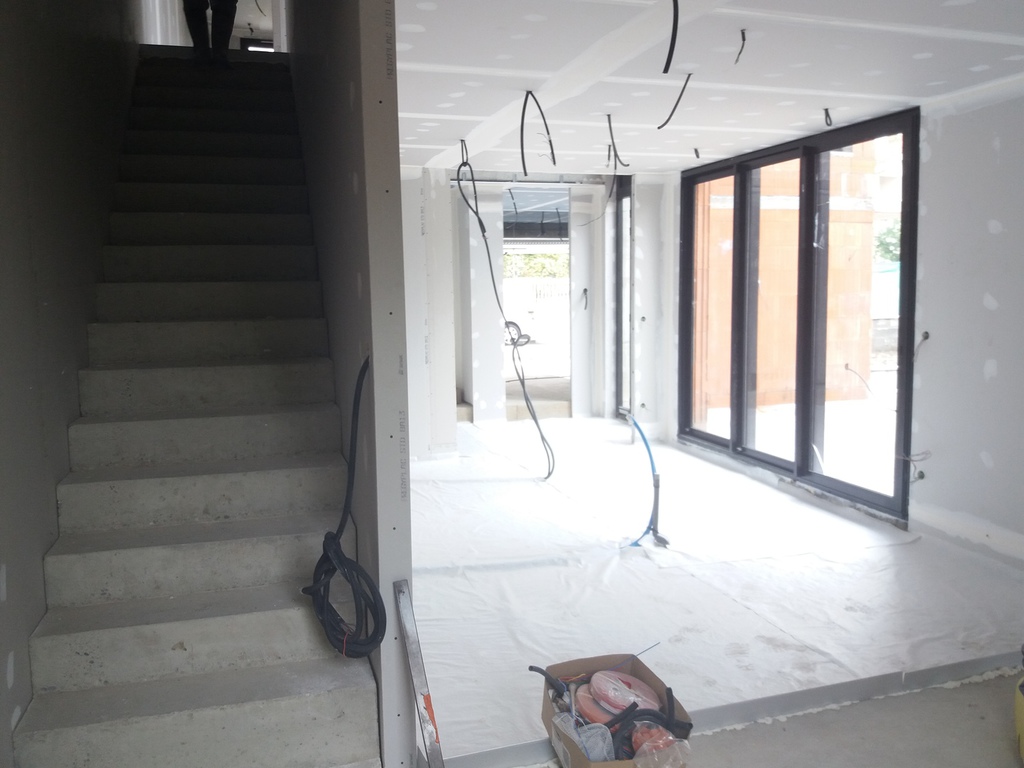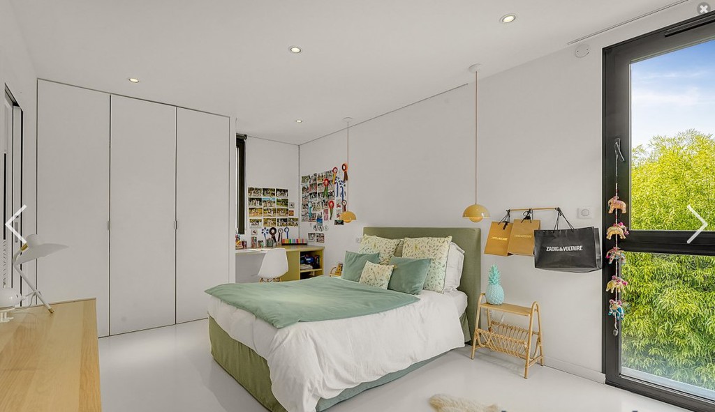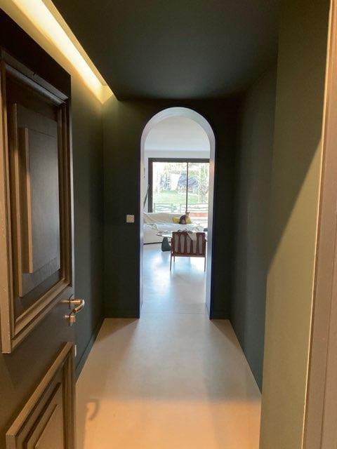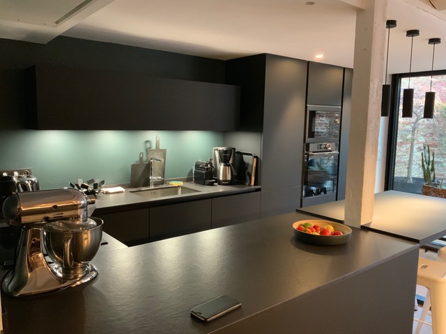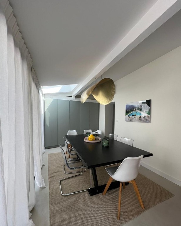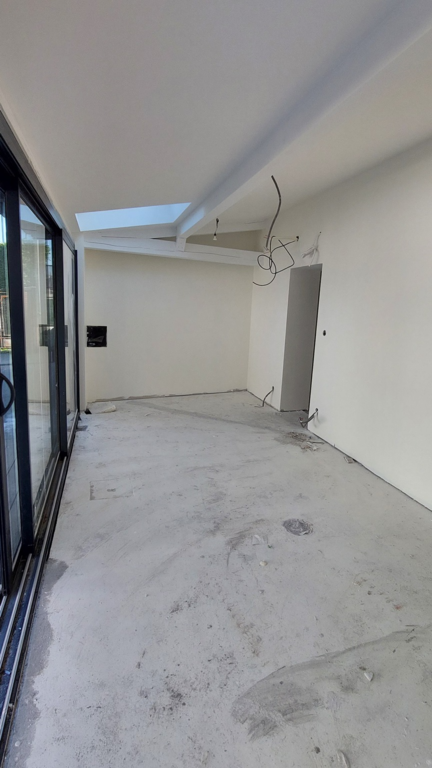 Petite extension sous une terrasse couverte. Une nouvelle baie vitrée de 9 mètres vient habiller la nouvelle façade. Rénovation de la maison (sols et peintures) et réaménagement complet de la chambre parentale - salle de bains -dressing.