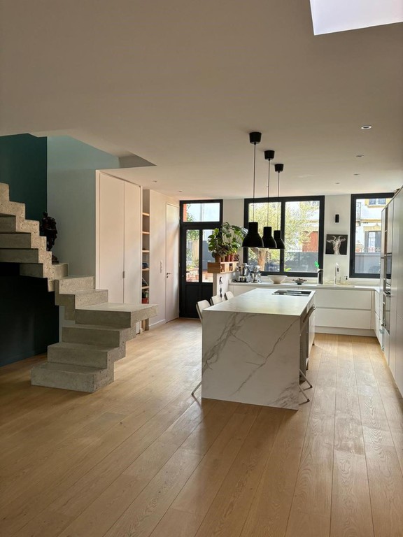 Pour ce projet les clients ont souhaité une façade plutôt traditionnelle avec des briques à l'ancienne de la briquetterie de Nagen. De ce fait, la maison s'intégre parfaitement bien dans le tissu urbain. En revanche, les volumes intérieurs sont totalement contemporains!